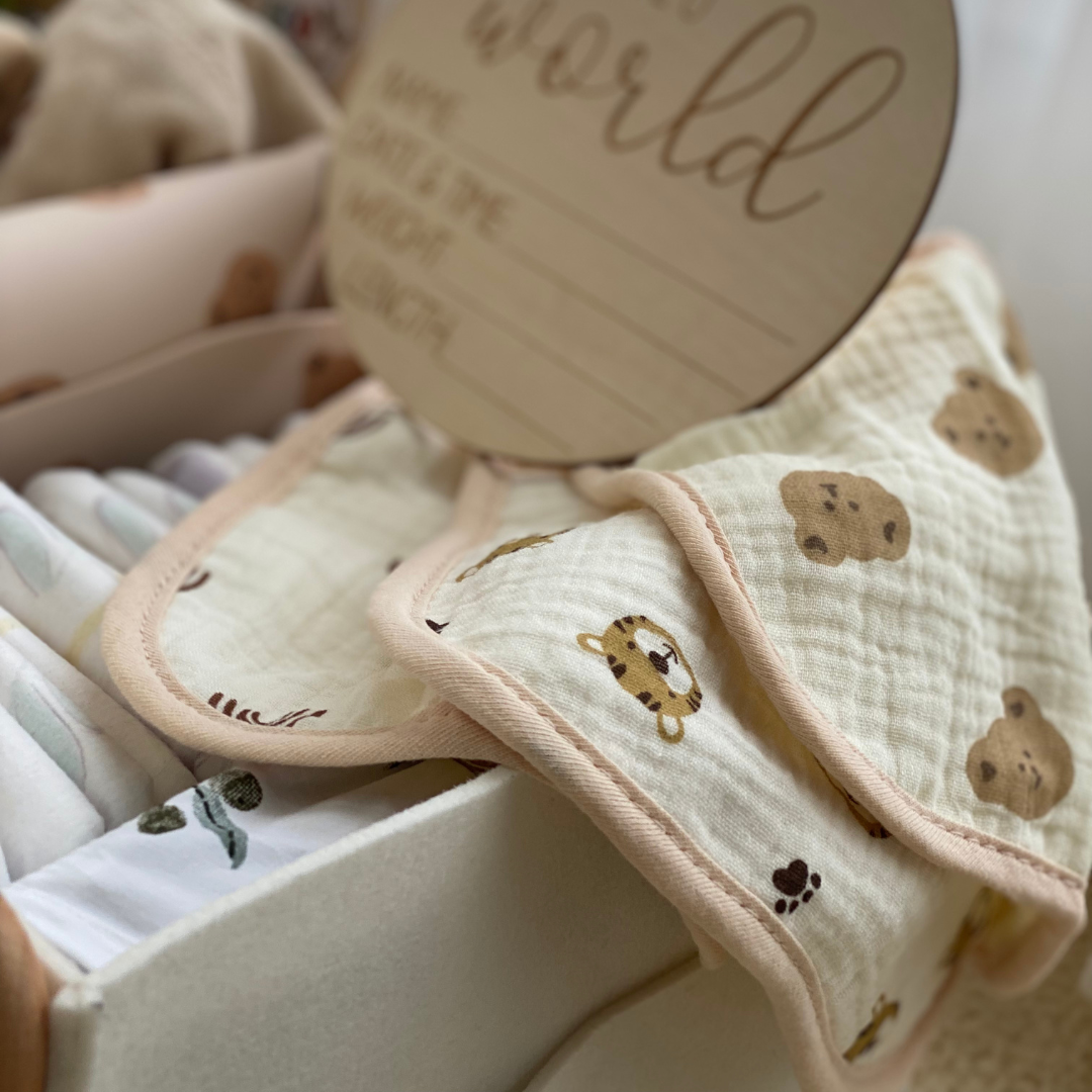 Introducing our range of material bibs, the perfect solution for keeping your little one clean during mealtime adventures! Crafted in soothing neutral tones and featuring three different designs, these bibs are as fashionable as they are functional.