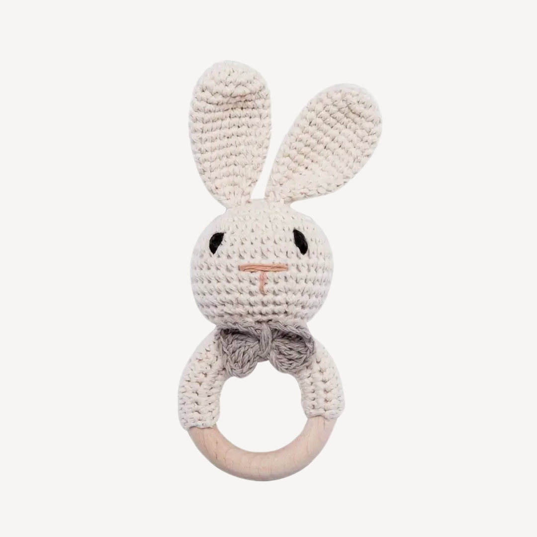 Featuring a wooden ring that's easy for tiny hands to grasp, our Baby Bunny Knitted Rattle doubles as a gentle teething toy, providing relief during those uncomfortable teething periods. The soft, knitted bunny design adds a touch of whimsy and warmth, making it an instant favourite for cuddles and playtime.
