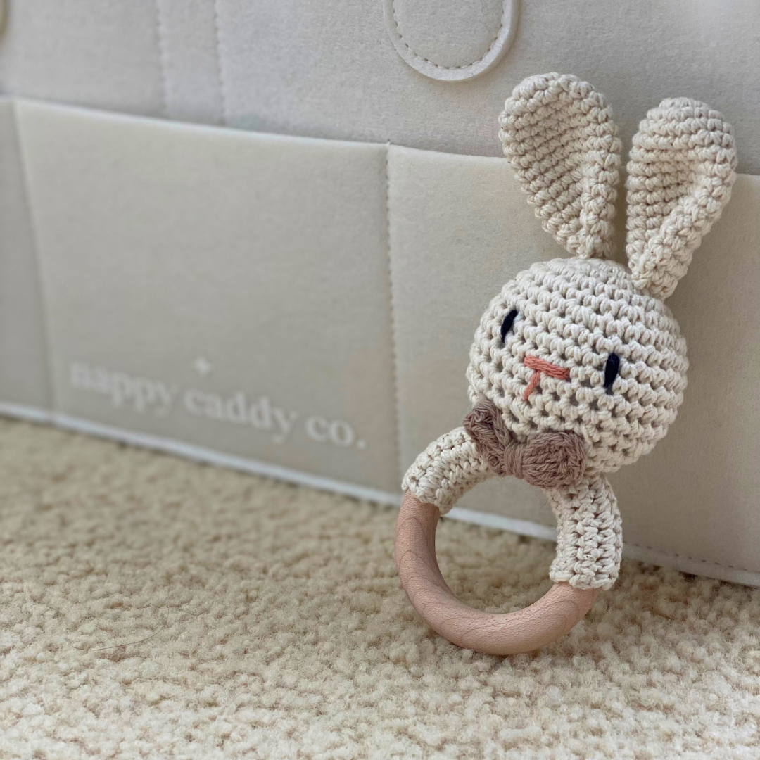 Add a touch of charm and functionality to your baby's playtime with our Baby Bunny Knitted Rattle. With its neutral tones and engaging design, it's the perfect addition to any nursery or nappy caddy.