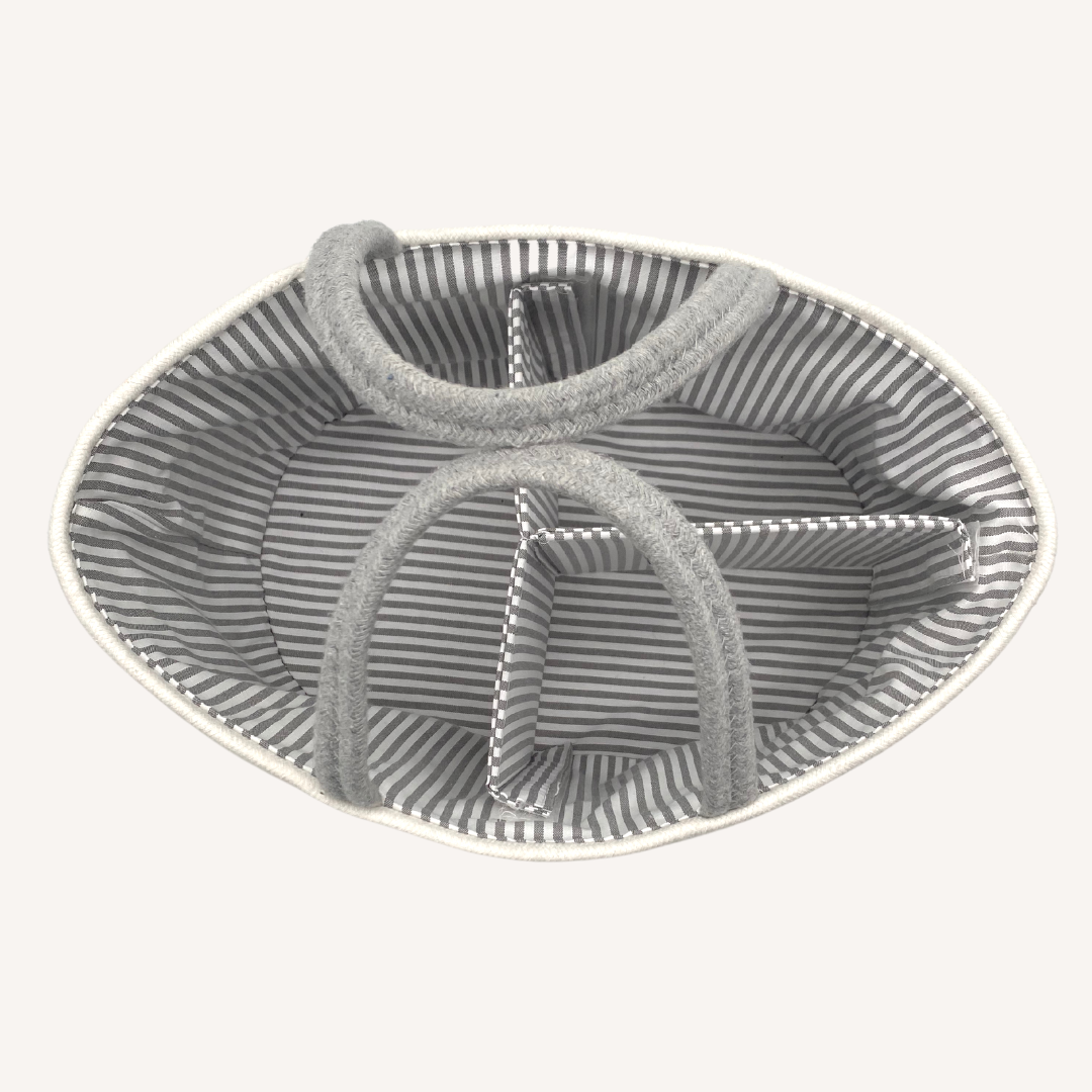 The interior of this caddy is lined with a grey and white striped material, enhancing its aesthetic appeal while providing a charming contrast to the rope exterior. Featuring detachable sections, you can easily create three separate storage spaces tailored to your needs, keeping everything neatly organised and within reach.